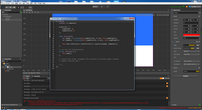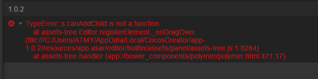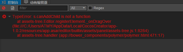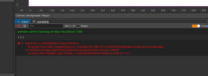 你的控制台信息中有一条很明确的 s.canAddChild is not a function 红色错误,错误并不在你的 Player.js 脚本中,而是在 assets-tree 中,说明你往 assets 面板中拖拽了有问题的资源,能不能看一下是哪个?