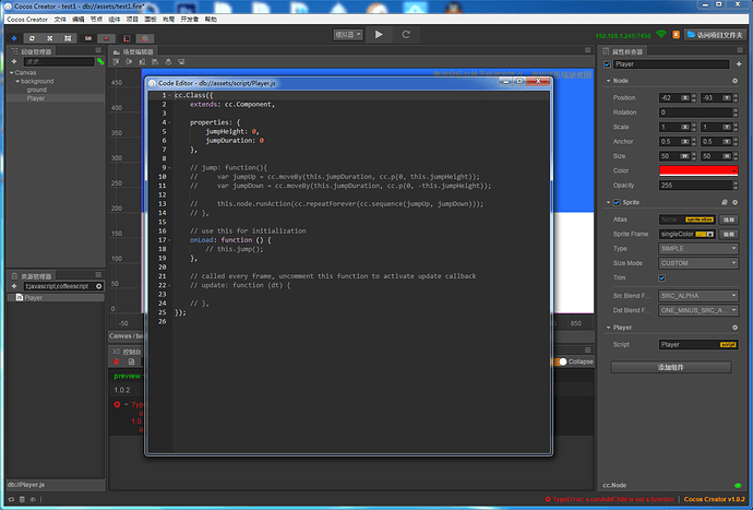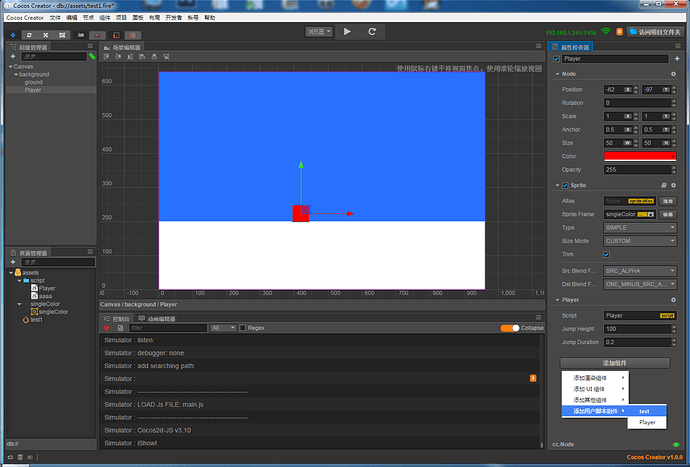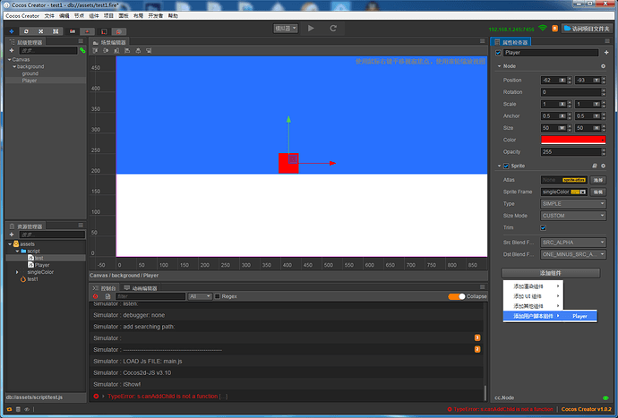 我是从HelloWorld项目里面拷贝过来的图片,2*2像素的,因为我刚刚接触creator,而且也没干啥,就是写了个脚本,添加了两个属性,但是属性检查器里没有我添加的两个属性,我的Player挂上去就是只有个脚本框,没有属性,现在我新建了一个test,但是添加组件里面找不到,而且我重启了编辑器和电脑都不行,然后我删了Player,脚本框提示我的脚本已删除或修改,这下才正常了,可以正常添加和显示属性