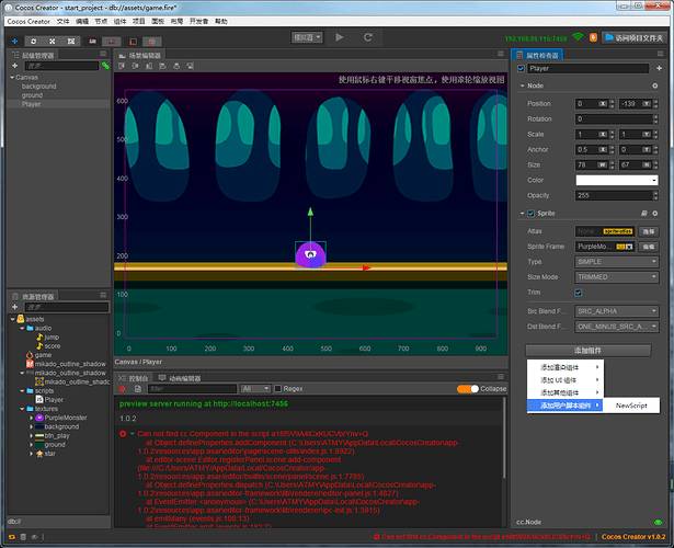 我照着官方文档的“快速上手:制作第一个游戏”,可是脚本编辑完想添加到Player上的时候就不行了,找不到我新建的脚本,用鼠标拖动过去就直接报错,望官方人员指点一二,刚刚接触creator,觉得比studio好得多