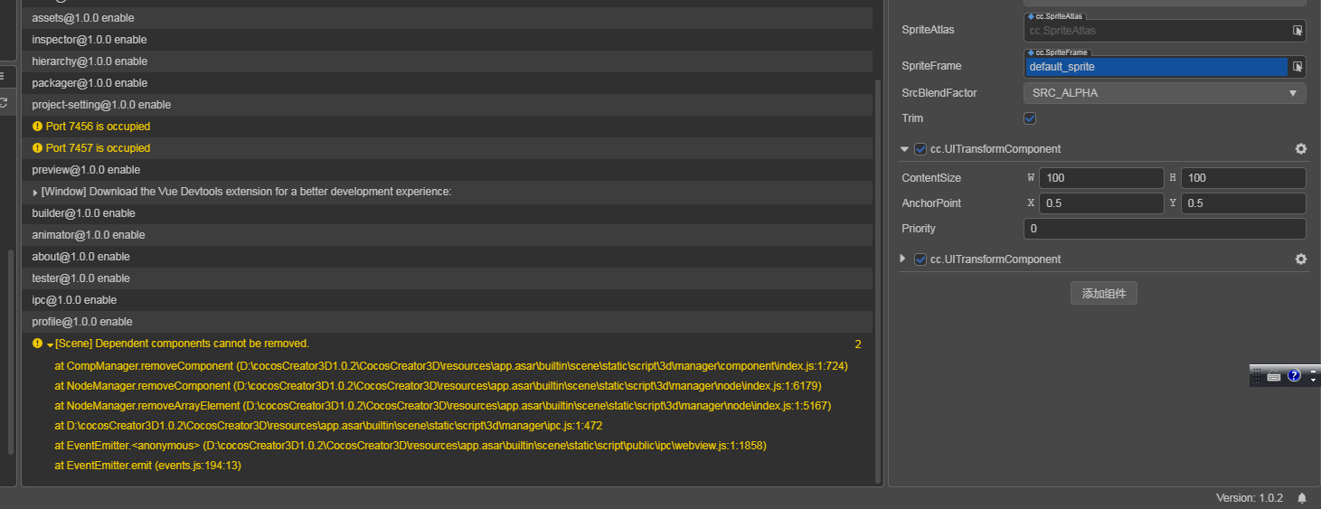 幸苦了,另外还发现了一个问题,一个节点上添加了两个UITransformComponent,删除其中一个时会报Dependent components cannot be removed. 组件无法删除