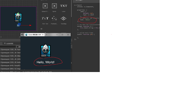 界面编辑器只会初始化脚本的properties数据,不运行脚本的,所以text: 'Hello, World!'这个在编辑器不会被渲染出来,如果你改了这个字段,你需要回到编辑器,因为只有回到编辑器界面脚本修改才会被同步,然后你的浏览器才能刷新到最终的修改结果。