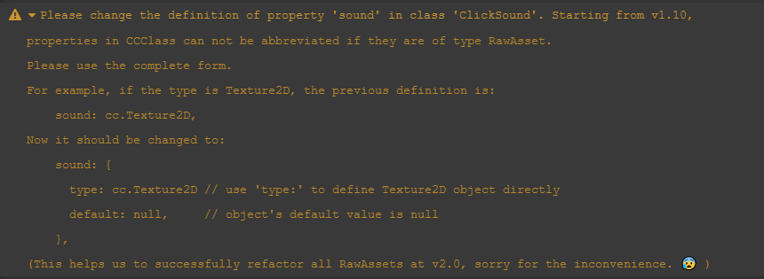 凭啥呢?因为之后版本,你原先那么写,将会得到 cc.AudioClip 对象,而不是字符串。这是一个无法兼容旧版本的破坏性的升级,所以要先用警告,确保所有老用户都不再这么用。没人这么用了的话到时候这么升级就不会对旧项目造成影响。
