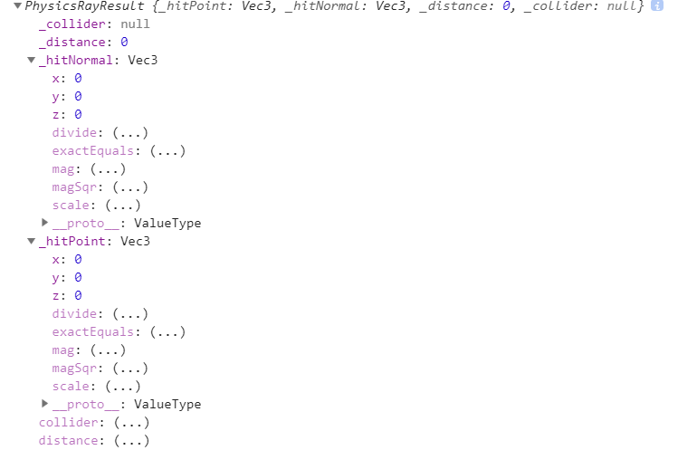 就是raycastClosestResult这个是用来干嘛的 我之前的理解是用于获取最近的相交的collider 但是获取之后raycastClosest的结果看起来里面coolider是空的 其他的也是0,0,0,这样的数据