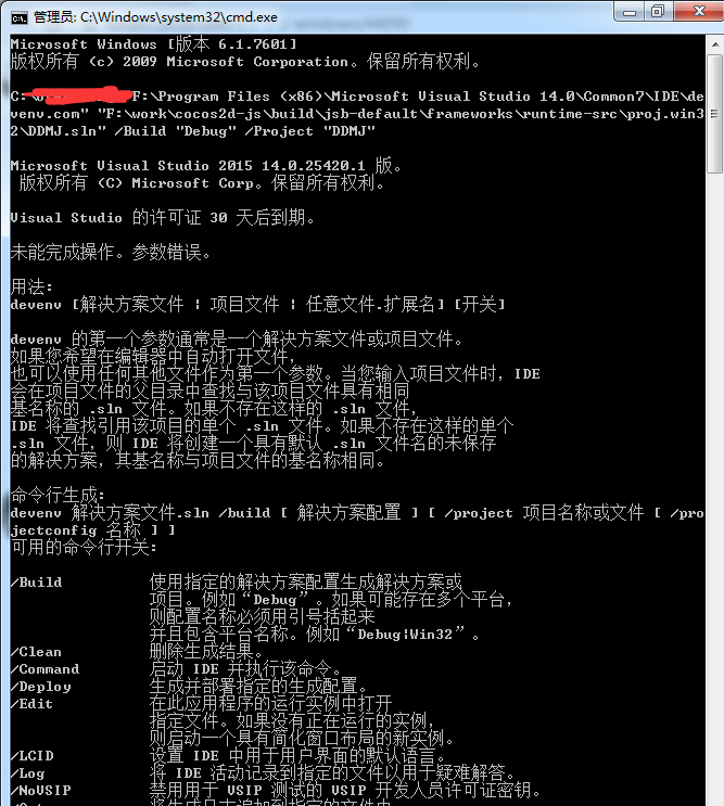 正在执行:’“F:\Program Files (x86)\Microsoft Visual Studio 14.0\Common7\IDE\devenv.com” “F:\work\cocos2d-js\build\jsb-default\frameworks\runtime-src\proj.win32\DDMJ.sln” /Build “Debug” /Project “DDMJ”’