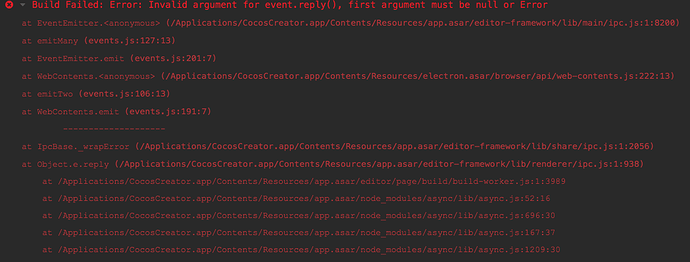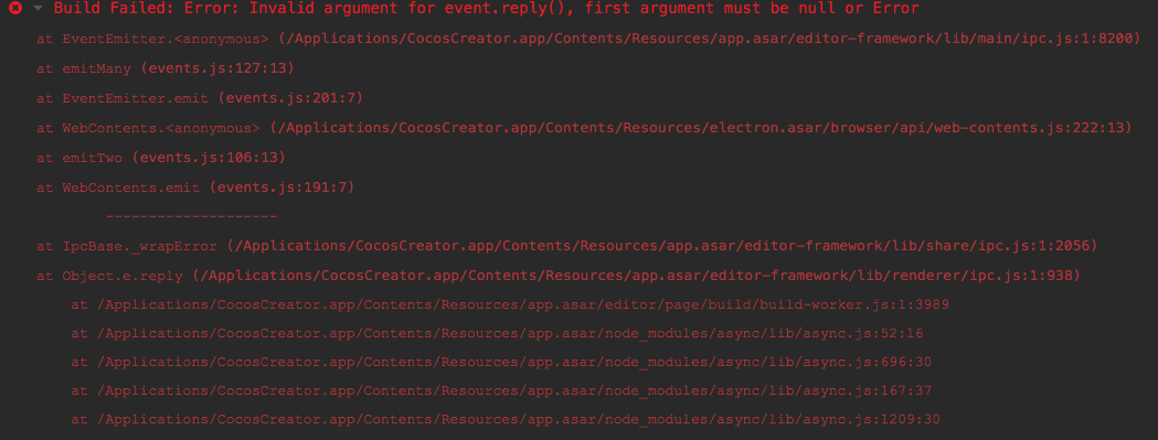 - 详细报错信息,包含调用堆栈:Build Failed: Error: Invalid argument for event.reply(), first argument must be null or Error