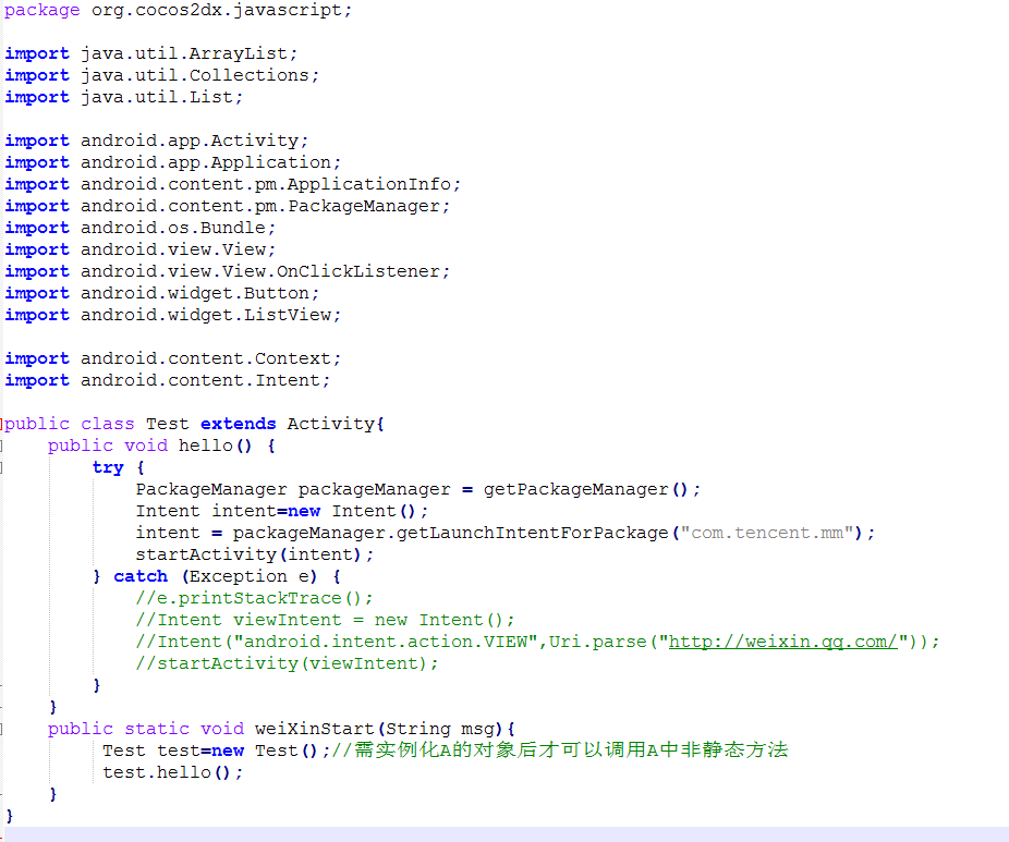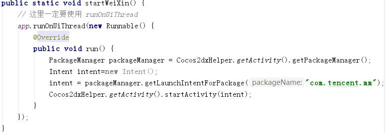jsb.reflection.callStaticMethod(“org/cocos2dx/javascript/Test”, “weiXinStart”, “(Ljava/lang/String;)V”, “this is a message from js”);