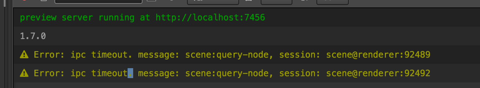 感觉是添加button的时候出来的错,因为当下没注意,所以不确定是不是。 Error: ipc timeout. message: scene:query-node, session: scene@renderer:92489 Error: ipc timeout. message: scene:query-node, session: scene@renderer:92492