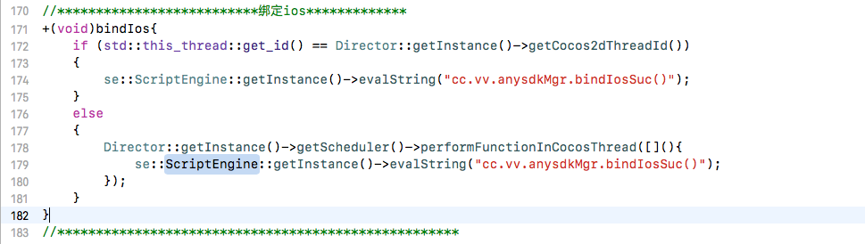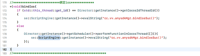 我的理解是 js 端调用 oc 端代码无效. 但问题是我之前把1.6.2的项目下编译的 build 文件删除后, 再用1.7重新构建编译后用 se::ScriptEngine::getInstance()->evalString(“cc.vv.anysdkMgr.bindIosSuc()”)