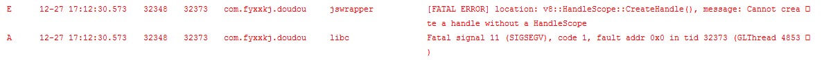 12-27 16:34:46.343: E/jswrapper(29600): [FATAL ERROR] location: v8::HandleScope::CreateHandle(), message: Cannot create a handle without a HandleScope