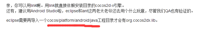 eclipse需要再导入一个cocos/platform/android/java工程目录才会有org.cocos2dx.lib。
