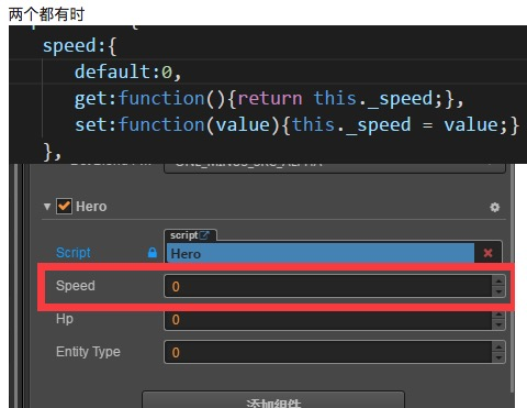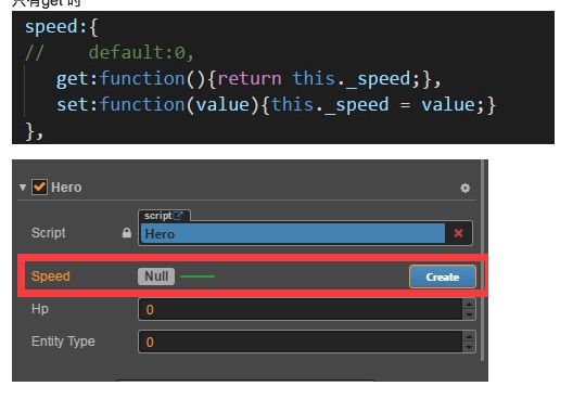 你2个都有的时候为什么会是0,是因为你写了 default: 0 ,编辑器里面默认给你的speed赋值为0, 但是由于你的default下面又写了get/set方法,所以编辑器下面会给你一个红色警告