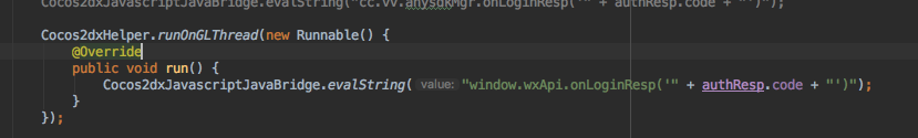 重现方式: Cocos2dxJavascriptJavaBridge.evalString(“cc.log(“Javascript Java bridge!”)”);