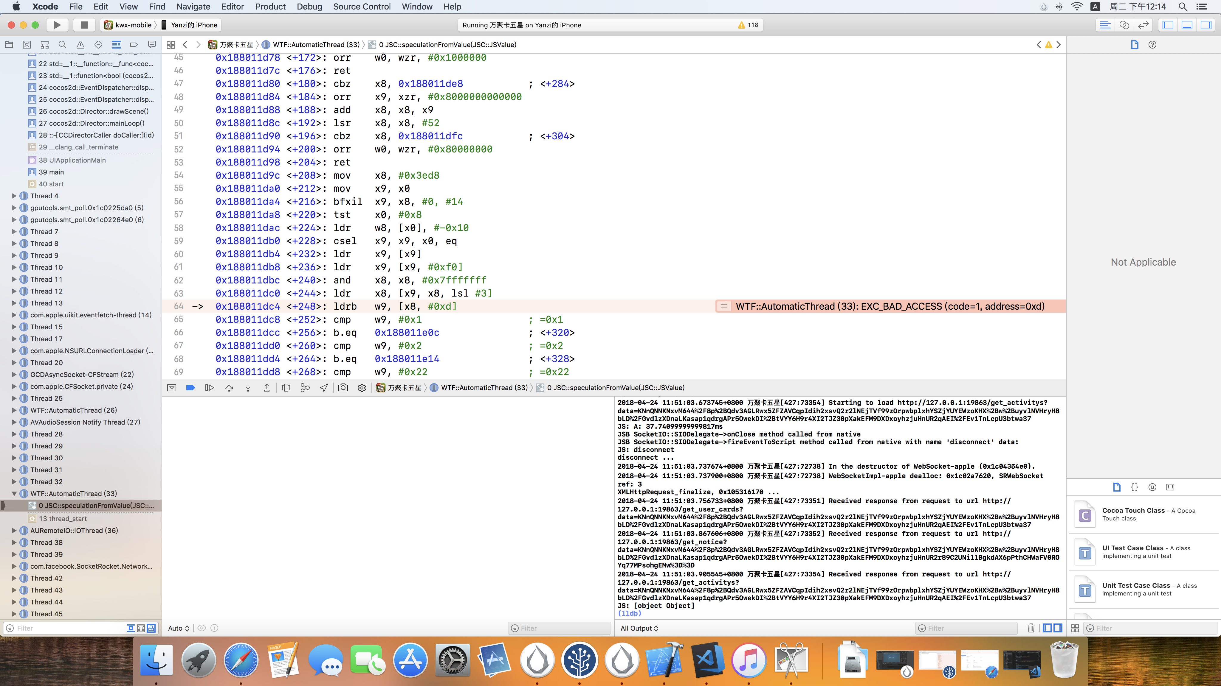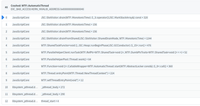 谢谢反馈,但是这个堆栈我也无能为力。因为在 jsc 的线程里面挂了。最好有个概率复现的 demo 吧。