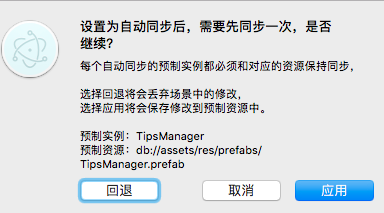 应该点击回退。这里应该自动回退,没有必要再点应用把对象赋值给prefab,因为有保存功能啊。