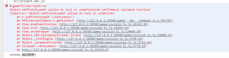 不过打包小游戏时候,一打开微信开发者工具就黑屏了并且报了这个错误:TypeError: Object.setPrototypeOf called on null or undefined,如图: