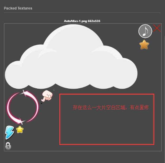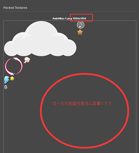 (2)然后就是,自动图集生成的图片大小居然比原本的碎图还大,并且图片固定死是10241024,即使我的碎图只有两张 1010的图片,生成自动图集之后,居然也是 10241024的图片,留了一大片的空白区域。。。