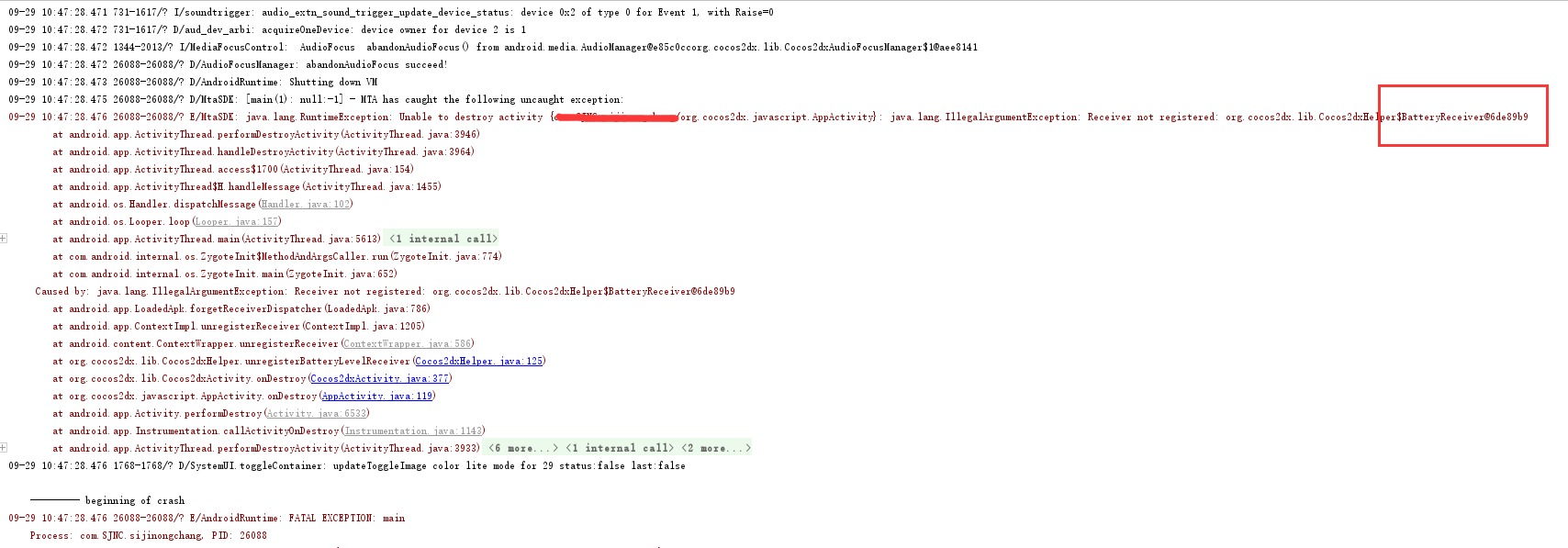 这边修改了Cocos2dxActivity里面的registerBatteryLevelReceiver 和unregisterBatteryLevelReceiver 调用的位置,从onCreate 和onDestory里,调整到onPause 和 onResume()里面了,等待测试结果。