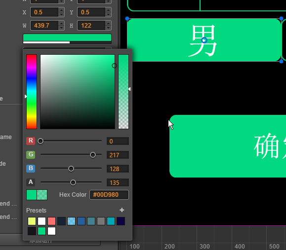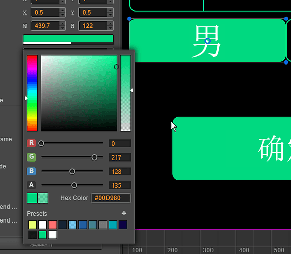 如图,调整节点透明度无效。只有等到改变颜色,透明度才会应用到节点上。