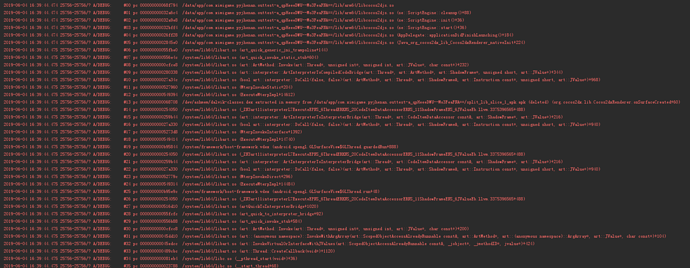 2019-06-04 16:39:38.707 20290-20405/? E/memtrack: Couldn't load memtrack module 2019-06-04 16:39:38.863 20290-20405/? E/memtrack: Couldn't load memtrack module 2019-06-04 16:39:42.708 15433-15433/? E/canna-debug: showKeyboardWithHKB -- 0 2019-06-04 16:39:42.815 676-720/? E/ANDR-PERF-MPCTL: Invalid profile no. 0, total profiles 0 only 2019-06-04 16:39:42.958 25473-25473/com.ximigame.pyjhenan.outtest E/Sensors: sendAck failure -1 1 2019-06-04 16:39:42.958 25473-25473/com.ximigame.pyjhenan.outtest E/Sensors: sendAck failure -1 2 2019-06-04 16:39:42.998 25473-25473/com.ximigame.pyjhenan.outtest E/Sensors: sendAck failure -1 1 2019-06-04 16:39:42.998 25473-25473/com.ximigame.pyjhenan.outtest E/Sensors: sendAck failure -1 2 2019-06-04 16:39:42.999 25473-25473/com.ximigame.pyjhenan.outtest E/Sensors: sendAck failure -1 3 2019-06-04 16:39:42.999 25473-25473/com.ximigame.pyjhenan.outtest E/Sensors: sendAck failure -1 4 2019-06-04 16:39:42.999 25473-25473/com.ximigame.pyjhenan.outtest E/Sensors: sendAck failure -1 5 2019-06-04 16:39:42.999 25473-25473/com.ximigame.pyjhenan.outtest E/Sensors: sendAck failure -1 6 2019-06-04 16:39:42.999 25473-25473/com.ximigame.pyjhenan.outtest E/Sensors: sendAck failure -1 7 2019-06-04 16:39:42.999 25473-25473/com.ximigame.pyjhenan.outtest E/Sensors: sendAck failure -1 8 2019-06-04 16:39:42.999 25473-25473/com.ximigame.pyjhenan.outtest E/Sensors: sendAck failure -1 8 2019-06-04 16:39:42.999 25473-25473/com.ximigame.pyjhenan.outtest E/Sensors: sendAck failure -1 9 2019-06-04 16:39:42.999 25473-25473/com.ximigame.pyjhenan.outtest E/Sensors: sendAck failure -1 10 2019-06-04 16:39:42.999 25473-25473/com.ximigame.pyjhenan.outtest E/Sensors: sendAck failure -1 11 2019-06-04 16:39:42.999 25473-25473/com.ximigame.pyjhenan.outtest E/Sensors: sendAck failure -1 12 2019-06-04 16:39:42.999 25473-25473/com.ximigame.pyjhenan.outtest E/Sensors: sendAck failure -1 12 2019-06-04 16:39:42.999 25473-25473/com.ximigame.pyjhenan.outtest E/Sensors: sendAck failure -1 13 2019-06-04 16:39:42.999 25473-25473/com.ximigame.pyjhenan.outtest E/Sensors: sendAck failure -1 14 2019-06-04 16:39:42.999 25473-25473/com.ximigame.pyjhenan.outtest E/Sensors: sendAck failure -1 14 2019-06-04 16:39:42.999 25473-25473/com.ximigame.pyjhenan.outtest E/Sensors: sendAck failure -1 15 2019-06-04 16:39:42.999 25473-25473/com.ximigame.pyjhenan.outtest E/Sensors: sendAck failure -1 16 2019-06-04 16:39:43.058 25473-25473/com.ximigame.pyjhenan.outtest E/Sensors: sendAck failure -1 1 2019-06-04 16:39:43.058 25473-25473/com.ximigame.pyjhenan.outtest E/Sensors: sendAck failure -1 1 2019-06-04 16:39:43.058 25473-25473/com.ximigame.pyjhenan.outtest E/Sensors: sendAck failure -1 2 2019-06-04 16:39:43.059 25473-25473/com.ximigame.pyjhenan.outtest E/Sensors: sendAck failure -1 3 2019-06-04 16:39:43.059 25473-25473/com.ximigame.pyjhenan.outtest E/Sensors: sendAck failure -1 4 2019-06-04 16:39:43.059 25473-25473/com.ximigame.pyjhenan.outtest E/Sensors: sendAck failure -1 5 2019-06-04 16:39:43.059 25473-25473/com.ximigame.pyjhenan.outtest E/Sensors: sendAck failure -1 6 2019-06-04 16:39:43.059 25473-25473/com.ximigame.pyjhenan.outtest E/Sensors: sendAck failure -1 7 2019-06-04 16:39:43.236 1683-4730/? E/LocationManagerService: request ad81aa4 gps Request[ACCURACY_FINE gps requested=+900ms fastest=+900ms lowPowerMode=false] from com.ximigame.pyjhenan.outtest(10371) 2019-06-04 16:39:43.237 1683-4730/? E/LocationManagerService: provider request: gps ProviderRequest[ON interval=+900ms lowPowerMode=false] 2019-06-04 16:39:43.263 25473-25473/com.ximigame.pyjhenan.outtest E/Sensors: sendAck failure -1 1 2019-06-04 16:39:44.044 25473-25738/com.ximigame.pyjhenan.outtest A/libc: Fatal signal 11 (SIGSEGV), code 0 (SI_USER) in tid 25738 (GLThread 22396), pid 25473 (yjhenan.outtest) 2019-06-04 16:39:44.168 1683-4730/? E/LocationManagerService: provider request: gps ProviderRequest[OFF] 2019-06-04 16:39:44.223 25756-25756/? E/DEBUG: failed to readlink /proc/25738/fd/204: No such file or directory 2019-06-04 16:39:44.442 25473-25473/com.ximigame.pyjhenan.outtest E/Sensors: sendAck failure -1 1 2019-06-04 16:39:44.442 25473-25473/com.ximigame.pyjhenan.outtest E/Sensors: sendAck failure -1 2 2019-06-04 16:39:44.459 25756-25756/? A/DEBUG: *** *** *** *** *** *** *** *** *** *** *** *** *** *** *** *** 2019-06-04 16:39:44.459 25756-25756/? A/DEBUG: Build fingerprint: 'Xiaomi/sirius/sirius:9/PKQ1.181121.001/V10.3.1.0.PEBCNXM:user/release-keys' 2019-06-04 16:39:44.460 25756-25756/? A/DEBUG: Revision: '0' 2019-06-04 16:39:44.460 25756-25756/? A/DEBUG: ABI: 'arm64' 2019-06-04 16:39:44.460 25756-25756/? A/DEBUG: pid: 25473, tid: 25738, name: GLThread 22396 >>> com.ximigame.pyjhenan.outtest <<< 2019-06-04 16:39:44.460 25756-25756/? A/DEBUG: signal 11 (SIGSEGV), code 0 (SI_USER), fault addr -------- 2019-06-04 16:39:44.460 25756-25756/? A/DEBUG: x0 0000000000000000 x1 0000000000000000 x2 0000000000000005 x3 0000000000000003 2019-06-04 16:39:44.460 25756-25756/? A/DEBUG: x4 9ba30ba39afb6378 x5 0000000000000000 x6 0a1c2f1206160719 x7 19071606122f1c0a 2019-06-04 16:39:44.460 25756-25756/? A/DEBUG: x8 0000000000000000 x9 0000000000000001 x10 0000000000000000 x11 0000000000000021 2019-06-04 16:39:44.460 25756-25756/? A/DEBUG: x12 0000000000000003 x13 0000000000000000 x14 ffffffffff000000 x15 0a1c2f1206160719 2019-06-04 16:39:44.460 25756-25756/? A/DEBUG: x16 0000006f637b3a38 x17 0000007000e45674 x18 0000000000000001 x19 0000000000000000 2019-06-04 16:39:44.460 25756-25756/? A/DEBUG: x20 0000006f4bbfdf70 x21 0000006f4bbff588 x22 0000006f4bbff588 x23 0000006f637d3000 2019-06-04 16:39:44.460 25756-25756/? A/DEBUG: x24 0000006f4bbfe120 x25 0000006f4bbff588 x26 0000006f621f5ca0 x27 0000000000000003 2019-06-04 16:39:44.460 25756-25756/? A/DEBUG: x28 0000006f4bbfe1b0 x29 0000006f4bbfdf60 2019-06-04 16:39:44.460 25756-25756/? A/DEBUG: sp 0000006f4bbfdf40 lr 0000006f62bf4720 pc 0000006f62bf4794 2019-06-04 16:39:44.474 25756-25756/? A/DEBUG: backtrace: 2019-06-04 1