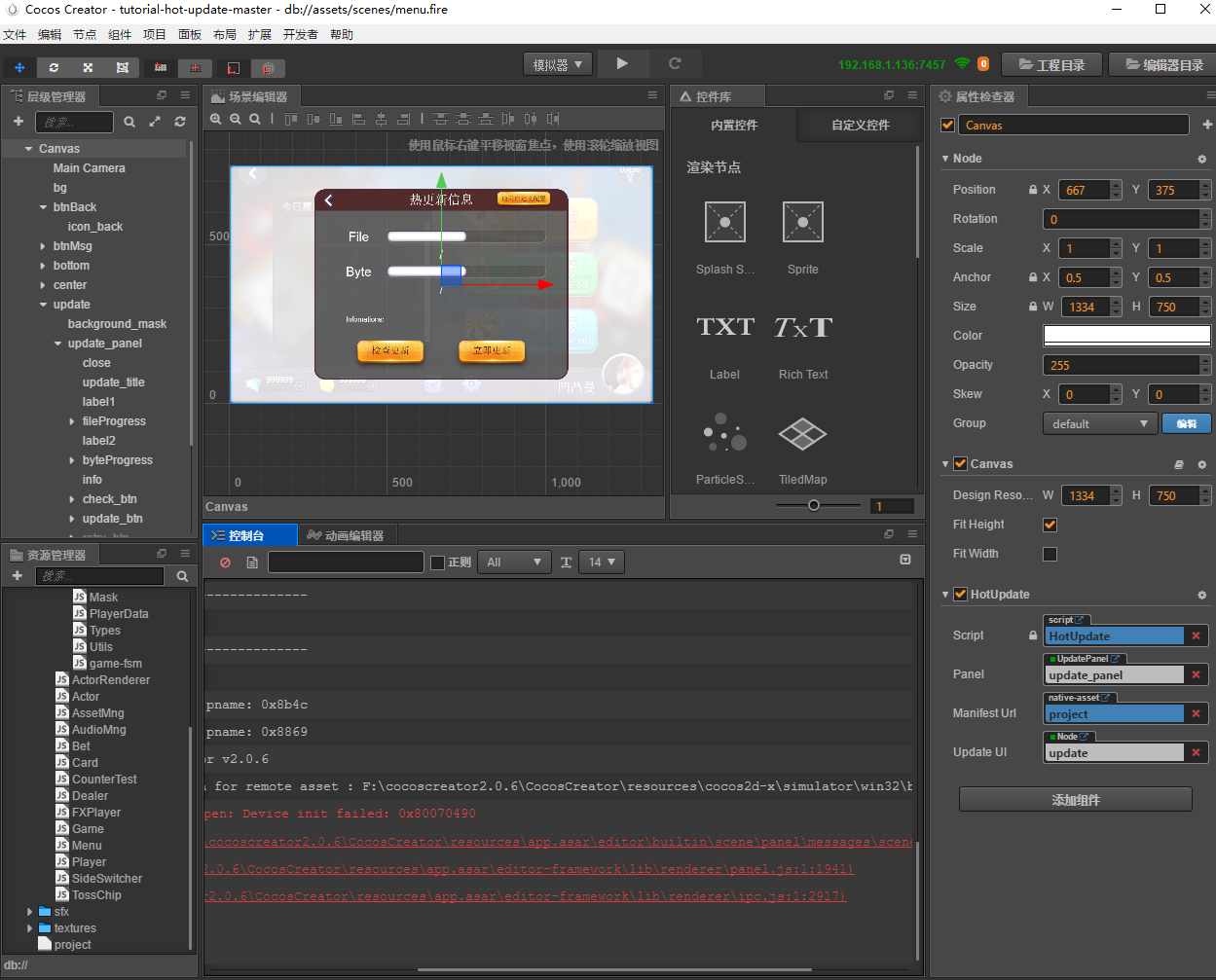 2.0.6版本的貌似不支持官网的热更新Demo啊