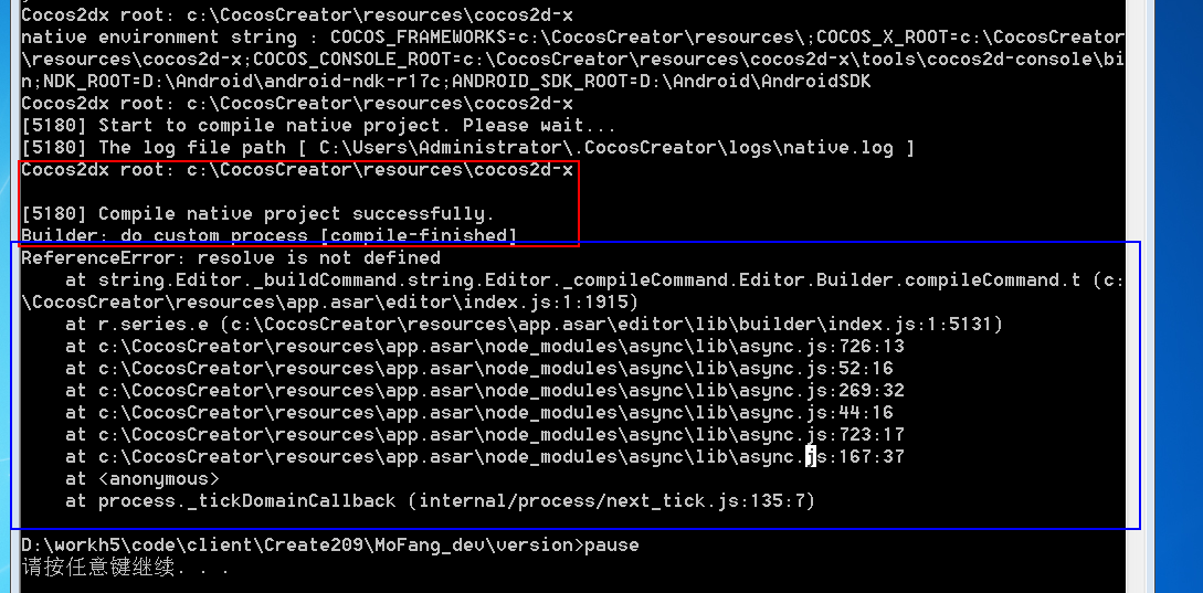 命令行出包完成了,然后蓝色框的一个报错,报的是啥错误,我是一个有强迫症的人。。。。。看着难受,apk正常出来了,打开creator卡的不行。。。。命令行出包,舒服