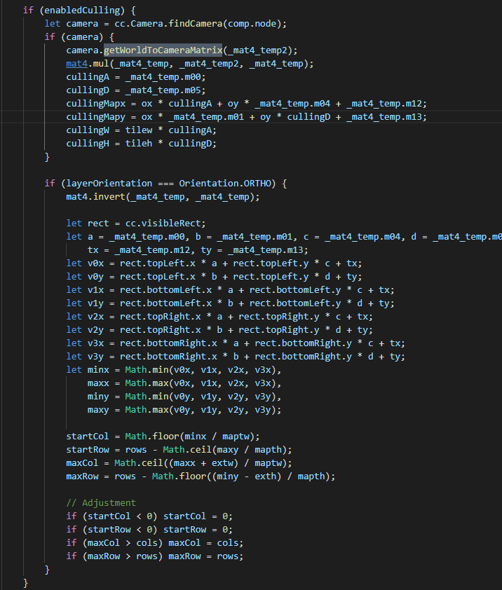 自己顶一下,分边找到了tiledmap裁剪 和 世界坐标到相机坐标的变换矩阵代码,不过看不是很懂,求指点。