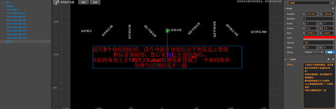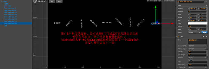 上面有8个角度的旋转Label,没有重新打开的情况下表现是正常的,但保存预制物,然后重新打开预制物时,那些旋转角度大于180度的Label都被重新设置了一个新的角度,导致与预期表现不一致。