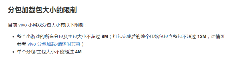 版本2.1.3在vivo小游戏打包时,如果勾选了“分包加载”,我的包大概3m,但文档上说的是4m,不知道为什么有500k的限定