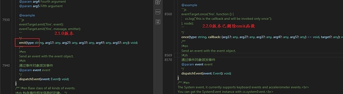 如图。以前的项目使用的是2.0.0的版本开发的,最近更新的新版的2.2.0的,发现EventTarget对象中的emit函数被去掉了,请问一下,需要使用哪个接口进行替换呢?