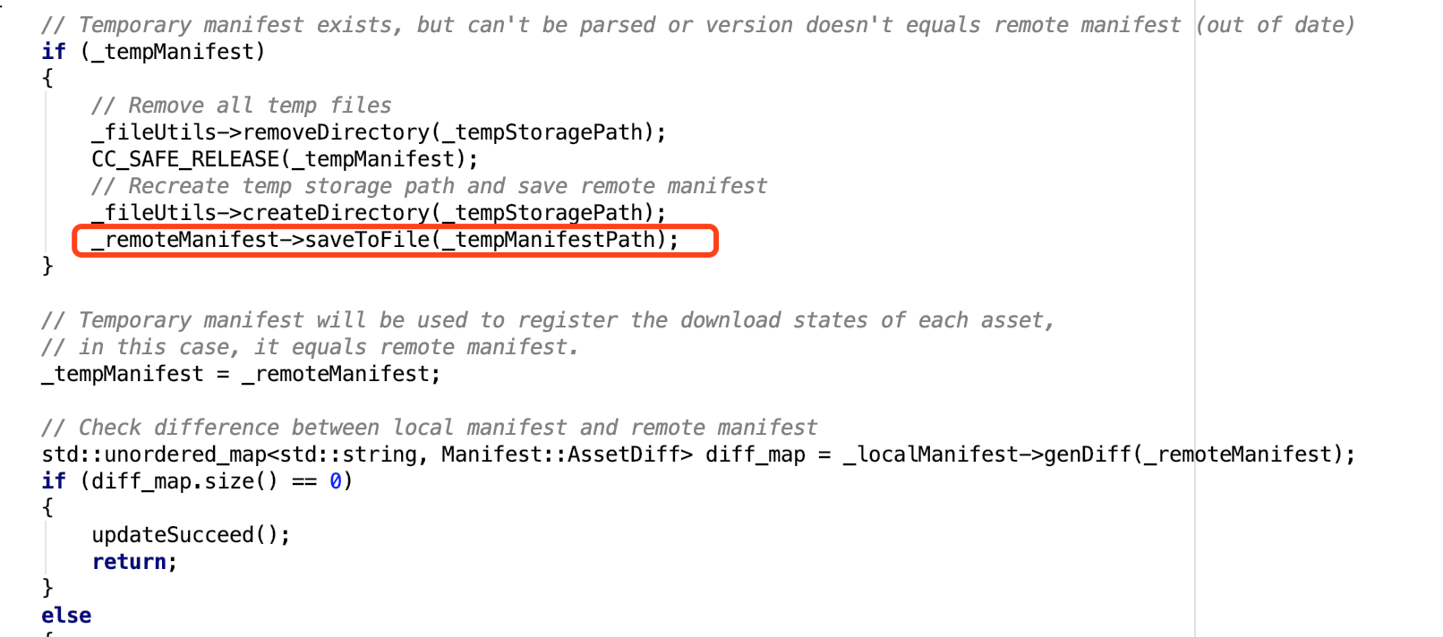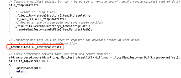 这个谜一般的操作很不解,在downloadManifest 时,已经调用createDownloadFileTask将远程的manifest下载到了 temp目录,当前文件就已经是远程的project.manifest,为什么要将它删除?而不是直接拿来用?