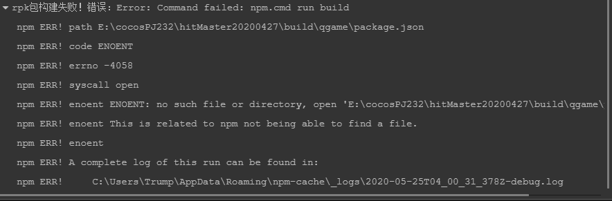 4 verbose stack Error: ENOENT: no such file or directory, open ‘E:\cocosPJ232\hitMaster20200427\build\qgame\package.json’