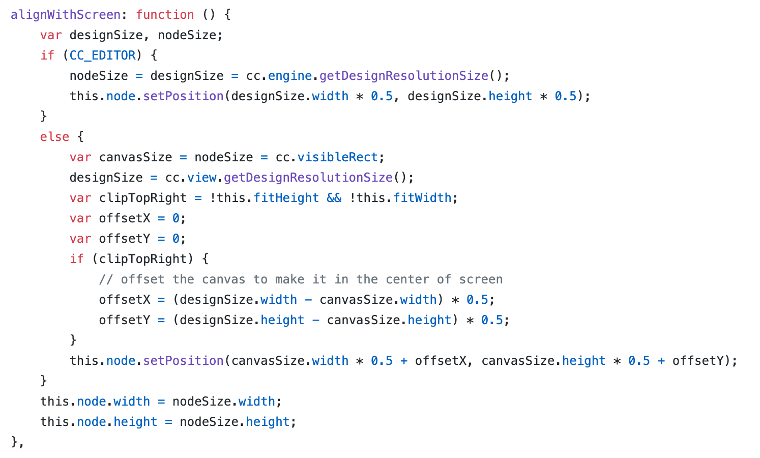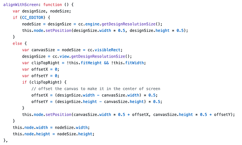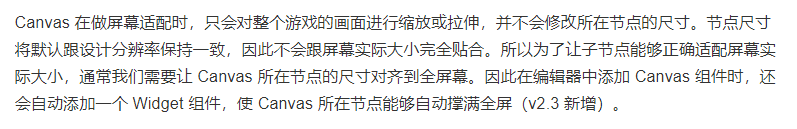 谢谢大大的分析。这部分行为应该是和旧版本保持不变的,从旧版本的源码可以看到,Canvas.alignWithScreen 中,不论是哪种适配模式,Canvas node 的尺寸都是等同于 visibleRect 的,和目前 Widget 的对齐行为一致。
