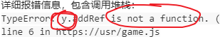 TypeError: y.addRef is not a function. (In 'y.addRef()', 'y.addRef' is undefined) at line 6 in https://usr/game.js https://usr/game.js:6:186287 _flow@https://usr/game.js:6:193341 https://usr/game.js:6:193464 _flow@https://usr/game.js:6:193341 async@https://usr/game.js:6:193285 https://usr/game.js:6:187981 forEach@https://usr/game.js:6:204507 https://usr/game.js:6:187776 _flow@https://usr/game.js:6:193341 https://usr/game.js:6:193464 https://usr/game.js:6:194238 _flow@https://usr/game.js:6:193341 async@https://usr/game.js:6:193285 E@https://usr/game.js:6:187600 https://usr/game.js:6:186479 https://usr/game.js:6:191785 parseImport@https://usr/game.js:6:191482 parse@https://usr/game.js:6:191685 https://usr/game.js:6:186363 _flow@https://usr/game.js:6:193341 https://usr/game.js:6:193464 https://usr/game.js:6:185665 https://usr/game.js:6:185558 _flow@https://usr/game.js:6:193341 async@https://usr/game.js:6:193285 https://usr/game.js:6:187981 forEach@https://usr/game.js:6:204507 https://usr/game.js:6:187776 _flow@https://usr/game.js:6:193341 https://usr/game.js:6:193464 https://usr/game.js:6:194238 _flow@https://usr/game.js:6:193341 async@https://usr/game.js:6:193285 loadAny@https://usr/game.js:6:154859 load@https://usr/game.js:6:158781 x@https://usr/game.js:2019:419782 https://usr/game.js:2019:421017 https://usr/game.js:2019:421502 https://usr/game.js:2019:423834 https://usr/game.js:2019:1327202 https://usr/game.js:2019:1061151 emit@https://usr/game.js:6:287851 emitEvents@https://usr/game.js:6:287534 _onTouchEnded@https://usr/game.js:6:279986 https://usr/game.js:6:479939 st@https://usr/game.js:6:113826 dispatchEvent@https://usr/game.js:6:129290 Q@https://usr/game.js:6:111968 _onTouchEventCallback@https://usr/game.js:6:385420 _dispatchEventToListeners@https://usr/game.js:6:387465 _dispatchTouchEvent@https://usr/game.js:6:386214 dispatchEvent@https://usr/game.js:6:391789 handleTouchesEnd@https://usr/game.js:6:436492 https://game:///adapter-min.js:1:13688 t@https://lib/WAGameSubContext.js:1:119197 https://lib/WAGame.js:1:409241 https://lib/WAGame.js:1:457573 https://lib/WAGameSubContext.js:1:113078 -