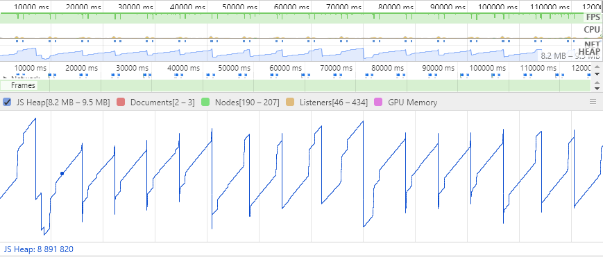 你好, JS GC 是由周期性和触发条件的。在释放之后多等待一短时间看看。如果没有降下来,那么就是 gc 没有触发。