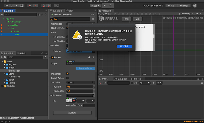 重现方式:新建项目,新建预制体,预制体添加任意脚本组件,预制体节点上添加 ScrollView,在content的item上添加 button组件,拖动预制体根节点到button组件event的cc.node上,弹出错误提示框