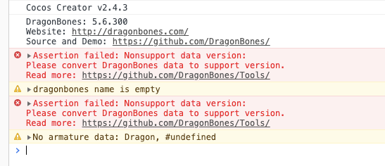 如题,我是从2.1.4升级到2.4.3的,升级完之后发现动态加载的DragonBones文件播放不了了,原生平台直接闪退或者卡死,web上会报错提示版本问题:
