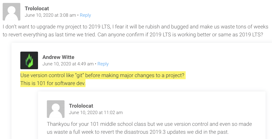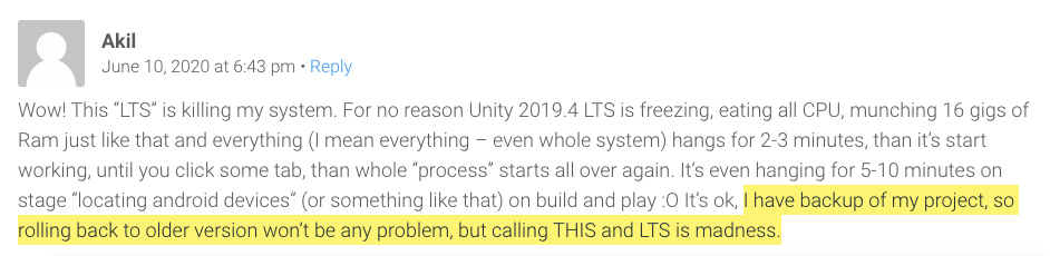 类似的言论在网上、论坛还有很多。友商很多方面是我们的榜样,但是即便友商,如果人力不足,在 LTS 上也是会翻车的。引擎是一个非常庞大复杂的机器,涉及各种各样的模块和不同的平台、资源,确实很难做到所有人都不出问题,希望大家多多谅解。只要大家能帮助我们发现问题,我们都会尽力解决。