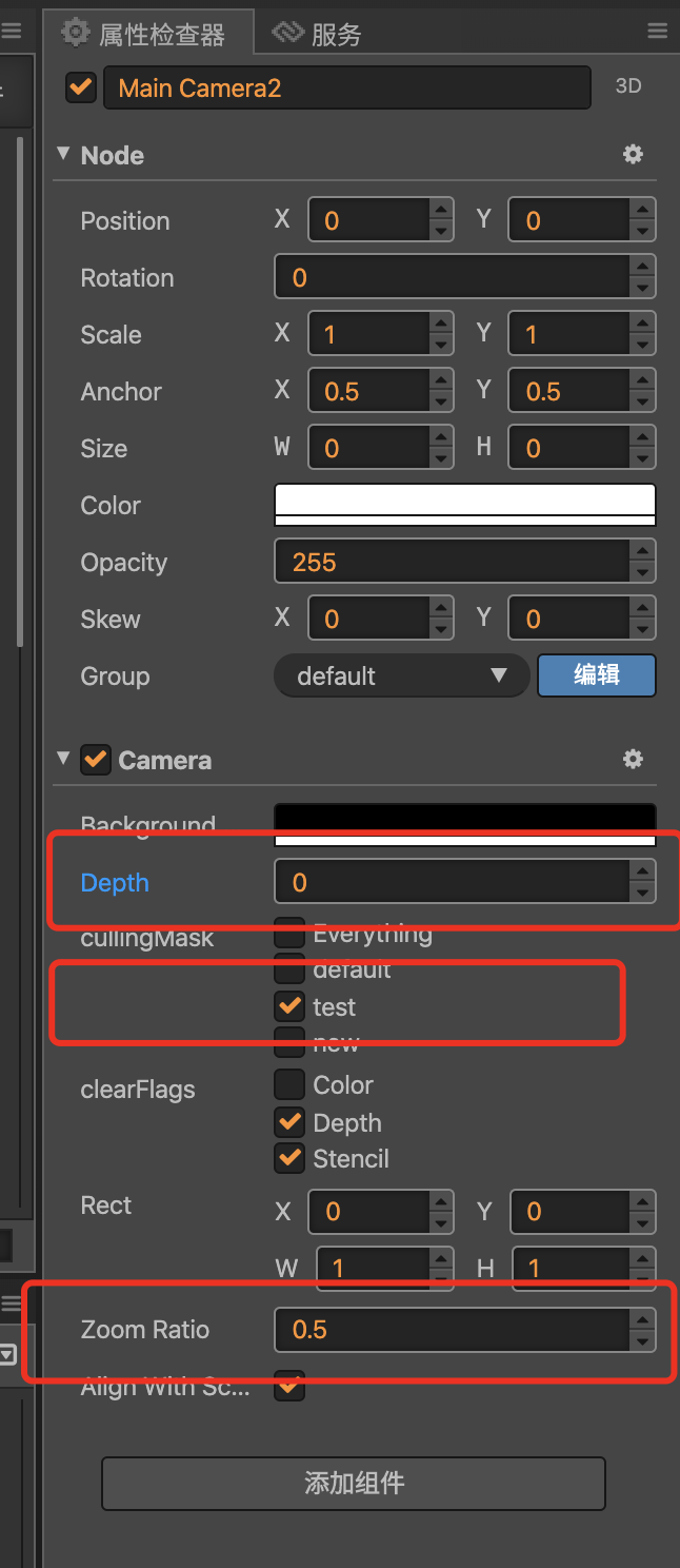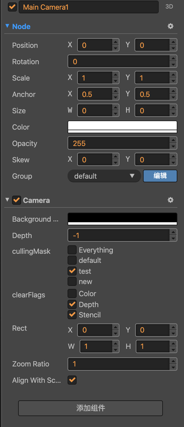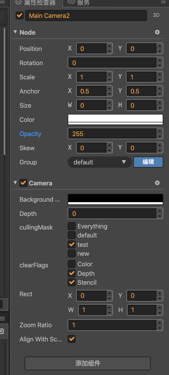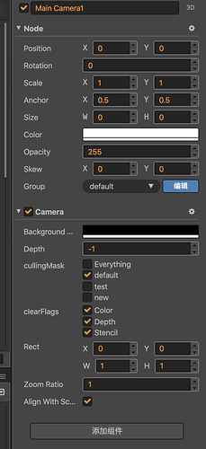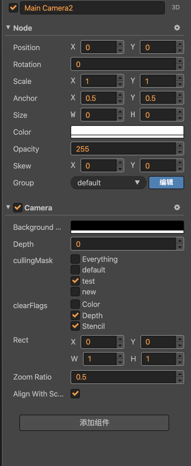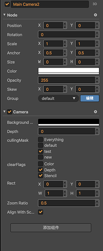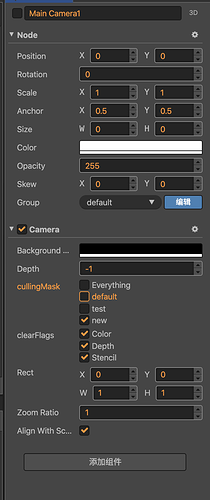 可以看到,确实只渲染出了test分组下的节点。即使test节点的父节点是new,也没有收到影响,也就是说节点树的结构与摄像机渲染是分开的。但是如果我们的分组中包含default分组,就会有其他的情况