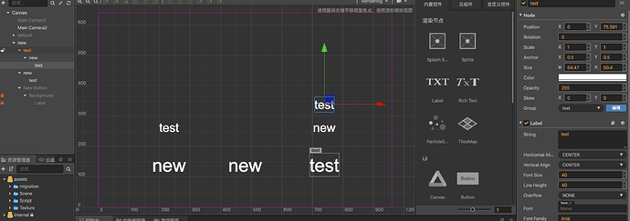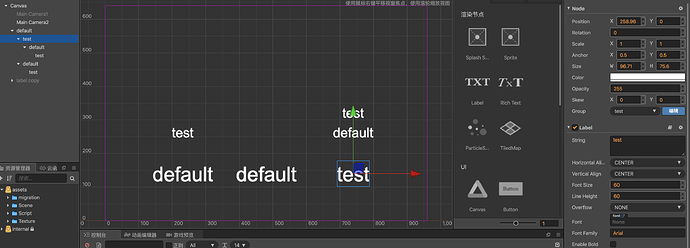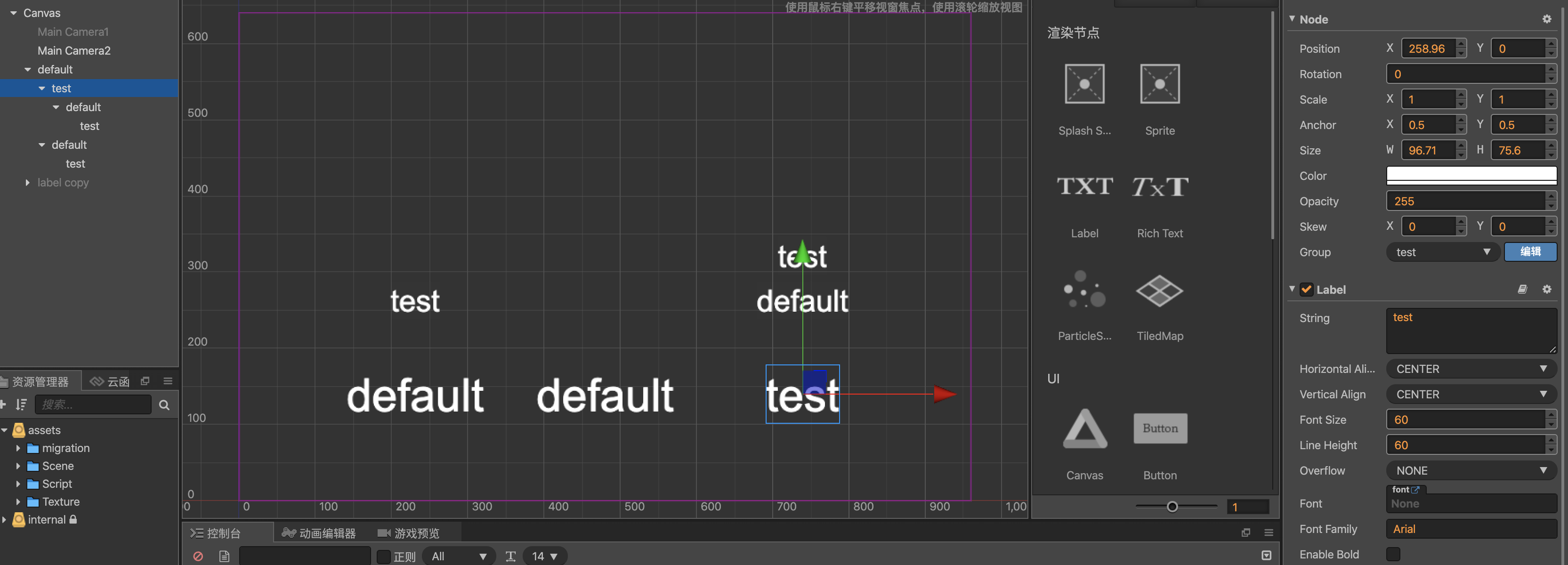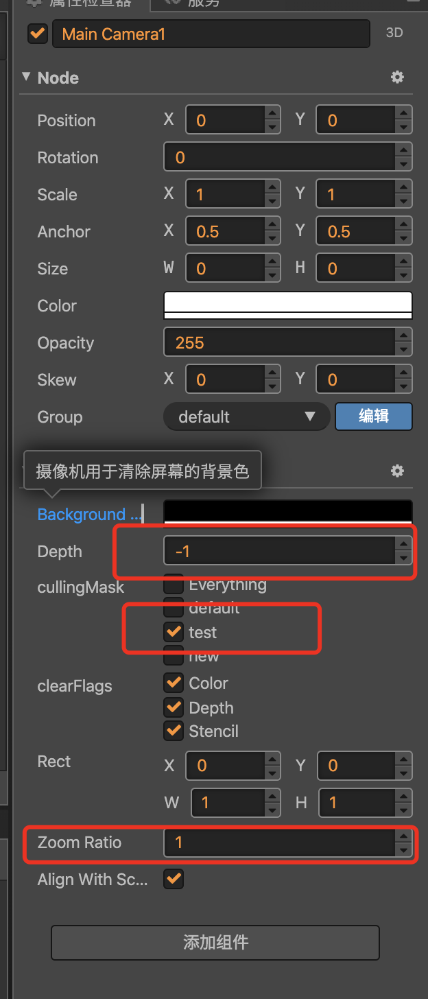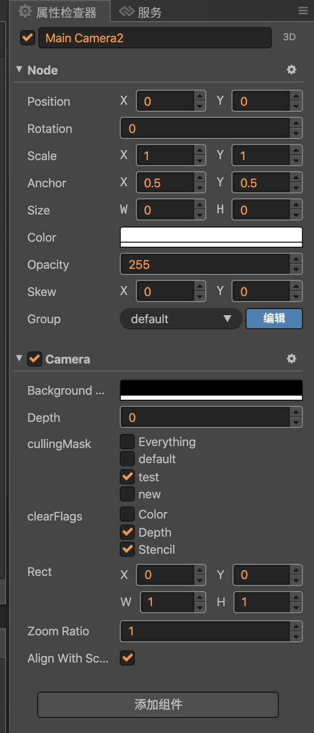 可以看到,确实只渲染出了test分组下的节点。即使test节点的父节点是new,也没有收到影响,也就是说节点树的结构与摄像机渲染是分开的。但是如果我们的分组中包含default分组,就会有其他的情况
