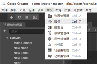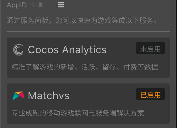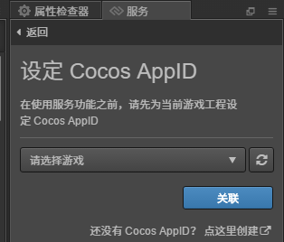 - 打开cocos creator 面板-服务 第一次使用 需要关联 Cocos Appid。点选下来菜单选择自己的游戏,没有的话点面包选下面的连接去创建