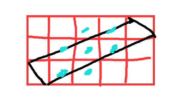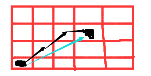 现在有一个问题是如果判断两个格子之间的行动路径是否有东西,比如上图,黑方块是主角从左下移动到右上的路线,这样子需要检测的格子就是蓝色点的格子是否有墙,如果有就不能直接移动过去,而要转弯