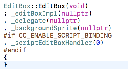 在创建UIEditBox控件的时候,有一个参数没有初始化,在模拟器上在使用这个空间的时候有可能会崩溃,走构造函数的时候没有初始化如图: 使用的时候