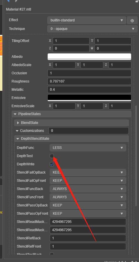 ,然后把材质的depth test关闭3d 动画就不显示了,属性如下: