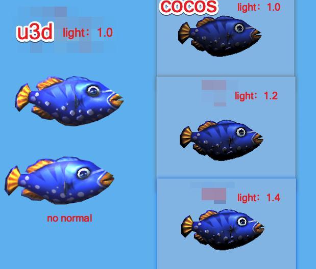 左边是unity,右边cocos,调整了光照强度,效果依然没有unity的那么自然,暗处细节丢失严重,边缘锯齿严重。