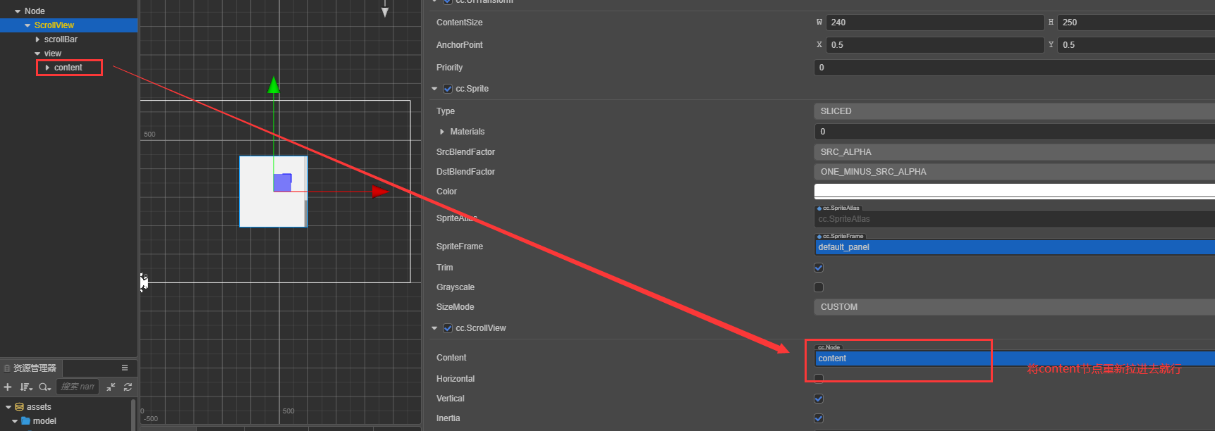 临时解决:在创建新的ScrollView,不知道为啥自动读取一个错的节点,将那个节点删了,重新将content节点拉进去就行了