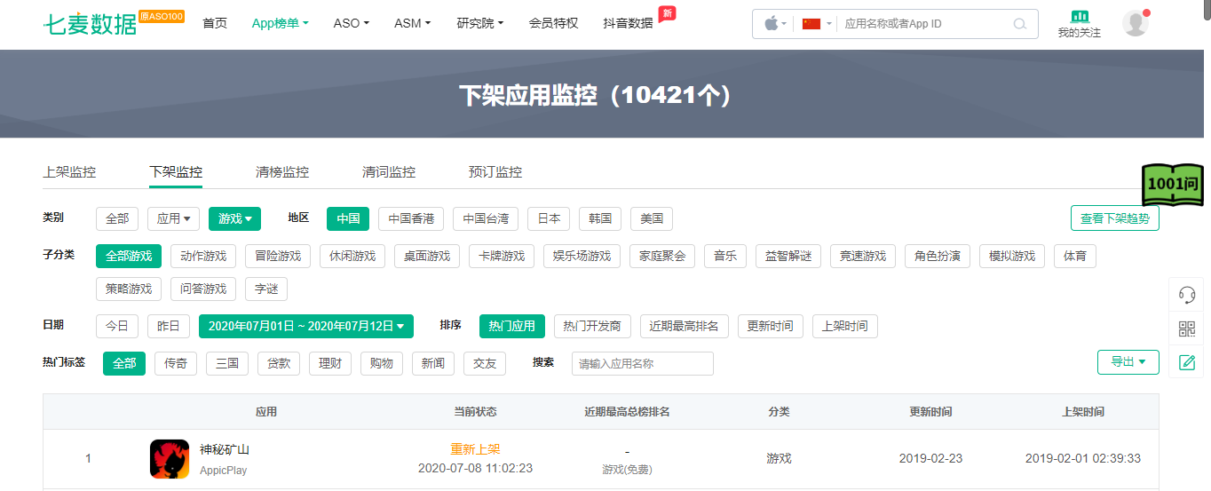 七麦数据显示,7.1—7.12日,中国区苹果App Store共下架10422款游戏,上架1026款;而上月同期(6.1-6.12日)共下架4648款游戏,上架1867款,分别同比增长124%、-45%。
