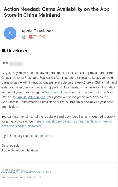 而就在7月1日,苹果修改了iTunes Connect后台,新上架的游戏需要在后台填写版号,上传相关附件。并在7月8日向游戏在中国区上架的开发者们发了这么一封邮件——邮件要求开发者在7月31日前提交版号和相关文件,如果没有提供,7月31日后,付费及免费含内购游戏将不会出现在中国大陆的苹果App Store,直到版号提交方可上线。