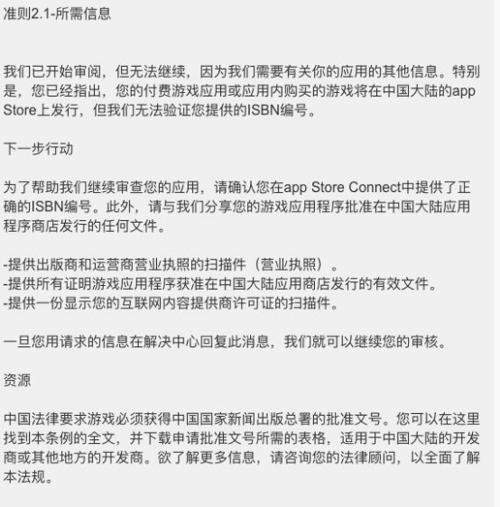 有一些心思活泛的朋友,会尝试采用假版号和套版号。不过经朋友试验,这种方式很难逃过苹果的审核,套用版号的游戏申请上架,会遭苹果驳回,并收到苹果邮件,要求重新填写可验证的版号信息,并提供出版商与运营商营业执照等相关文件。