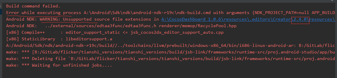 Error while executing process A:\Android\Sdk\ndk\android-ndk-r19c\ndk-build.cmd with arguments {NDK_PROJECT_PATH=null APP_BUILD_SCRIPT=B:\GitLab\flicker\tianshi_versions\tianshi_versions\build\jsb-link\frameworks\runtime-src\proj.android-studio\app\jni\Android.mk NDK_APPLICATION_MK=B:\GitLab\flicker\tianshi_versions\tianshi_versions\build\jsb-link\frameworks\runtime-src\proj.android-studio\app\jni\Application.mk APP_ABI=x86 NDK_ALL_ABIS=x86 NDK_DEBUG=1 APP_PLATFORM=android-16 NDK_OUT=B:/GitLab/flicker/tianshi_versions/tianshi_versions/build/jsb-link/frameworks/runtime-src/proj.android-studio/app/build/intermediates/ndkBuild/debug/obj NDK_LIBS_OUT=B:\GitLab\flicker\tianshi_versions\tianshi_versions\build\jsb-link\frameworks\runtime-src\proj.android-studio\app\build\intermediates\ndkBuild\debug\lib NDK_TOOLCHAIN_VERSION=clang NDK_MODULE_PATH=A:\CocosDashboard_1.0.6\resources\.editors\Creator\2.4.0\resources\cocos2d-x;A:\CocosDashboard_1.0.6\resources\.editors\Creator\2.4.0\resources\cocos2d-x\cocos;A:\CocosDashboard_1.0.6\resources\.editors\Creator\2.4.0\resources\cocos2d-x\external -j8 NDK_DEBUG=1 B:/GitLab/flicker/tianshi_versions/tianshi_versions/build/jsb-link/frameworks/runtime-src/proj.android-studio/app/build/intermediates/ndkBuild/debug/obj/local/x86/libcocos2djs.so}