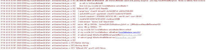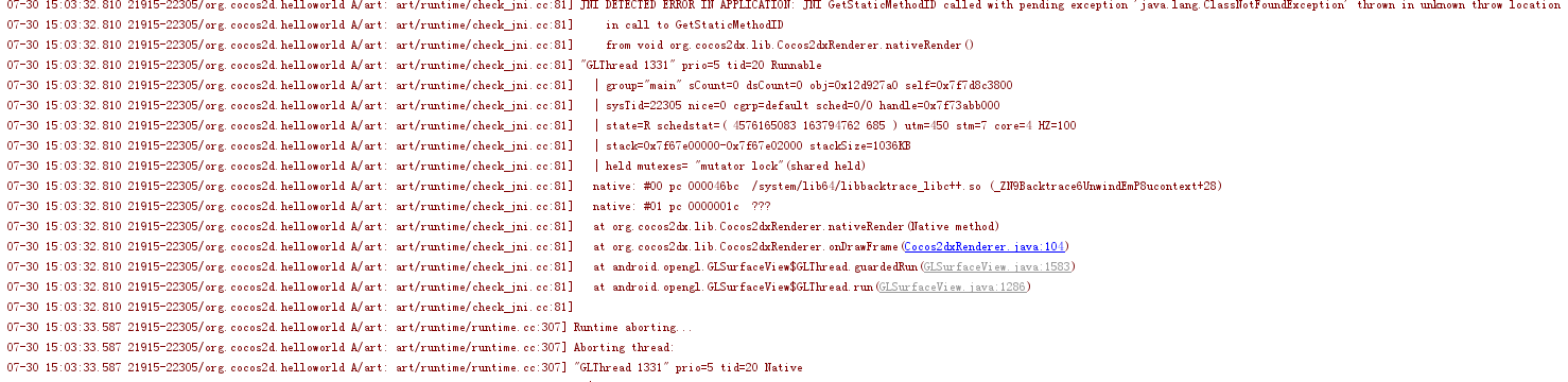 08-01 14:33:43.943 9081-9465/org.cocos2d.clientV2_HZMJ_NEW A/art: art/runtime/runtime.cc:307] at org.cocos2dx.lib.Cocos2dxRenderer.nativeRender(Native method)